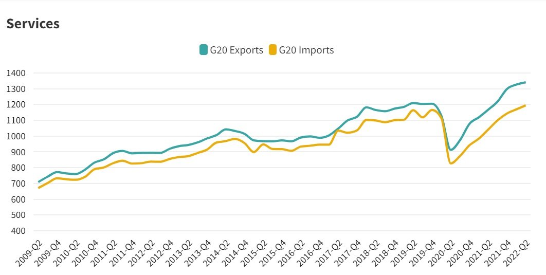Note: The Q2 2022 trade in services values are preliminary estimates based on available data, covering about 60% of exports and imports for the G20 aggregate.
