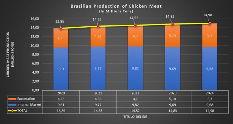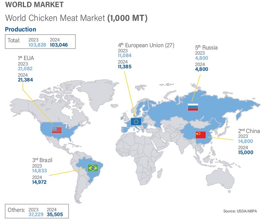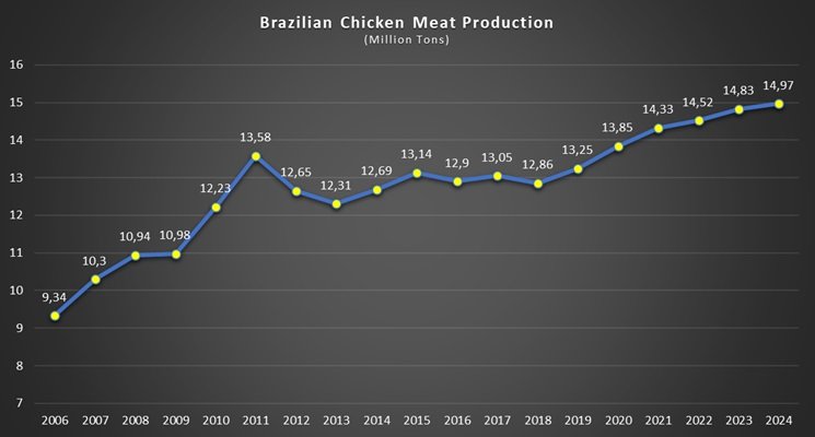 In 2021, China surpassed Brazil in chicken meat production by 200,000 tons, placing China in second place in the world rankings and Brazil in third. In 2023, Brazil surpassed China in production by 33,000 tons, thus regaining second place, but in 2024, China increased its production to 15 million tons, again surpassing Brazil by 28,000 tons. Thus, in 2024, Brazil remains the third-largest chicken meat producer in the world with 14.972 billion tons.