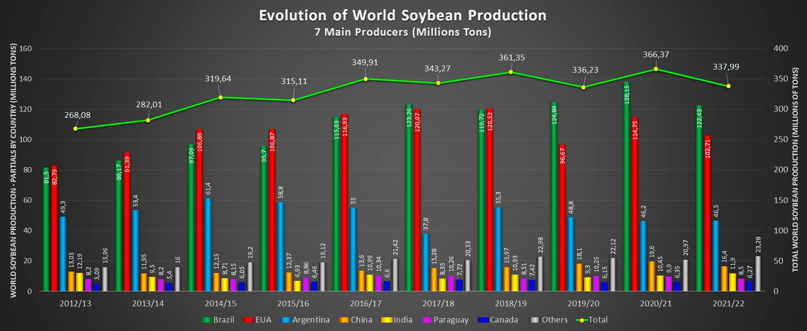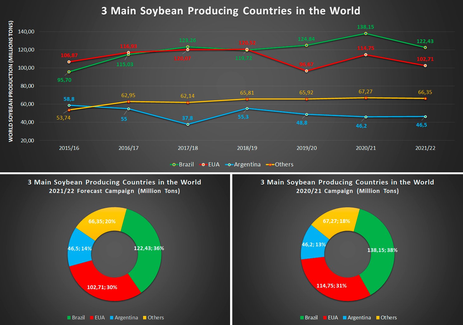 The 2021/22 campaign will once again have four South American countries among the 10 largest soybean producers in the world. The combined harvests of the southern cone will represent 55% of global soybean production, maintaining the share achieved last season.